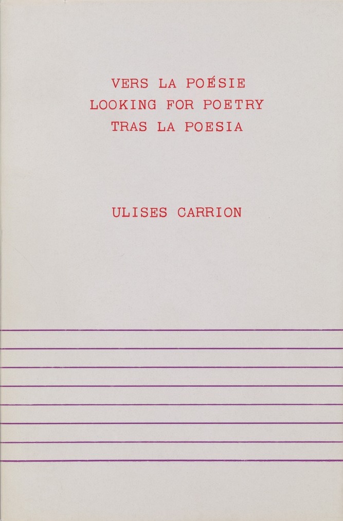Livre d’artiste d’Ulises Carrión présentant une série d’œuvres textuelles composées de mots individuels imprimés en parallèle en trois langues en rouge et violet sur du papier orange foncé.